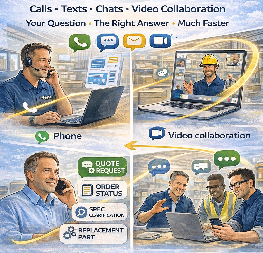 Vestil Connect is Vestil’s unified messaging and communications experience, designed to help distributors, dealers, and end users reach the right person faster. It brings together phone, SMS, chat-style communication, and video collaboration into one connected customer service approach so your question can move quickly to the right team.