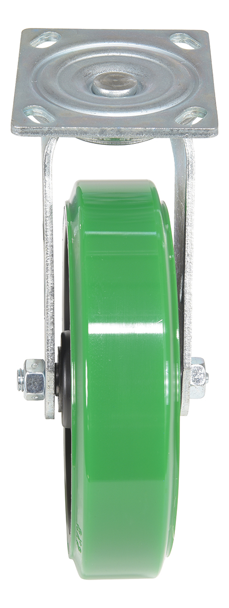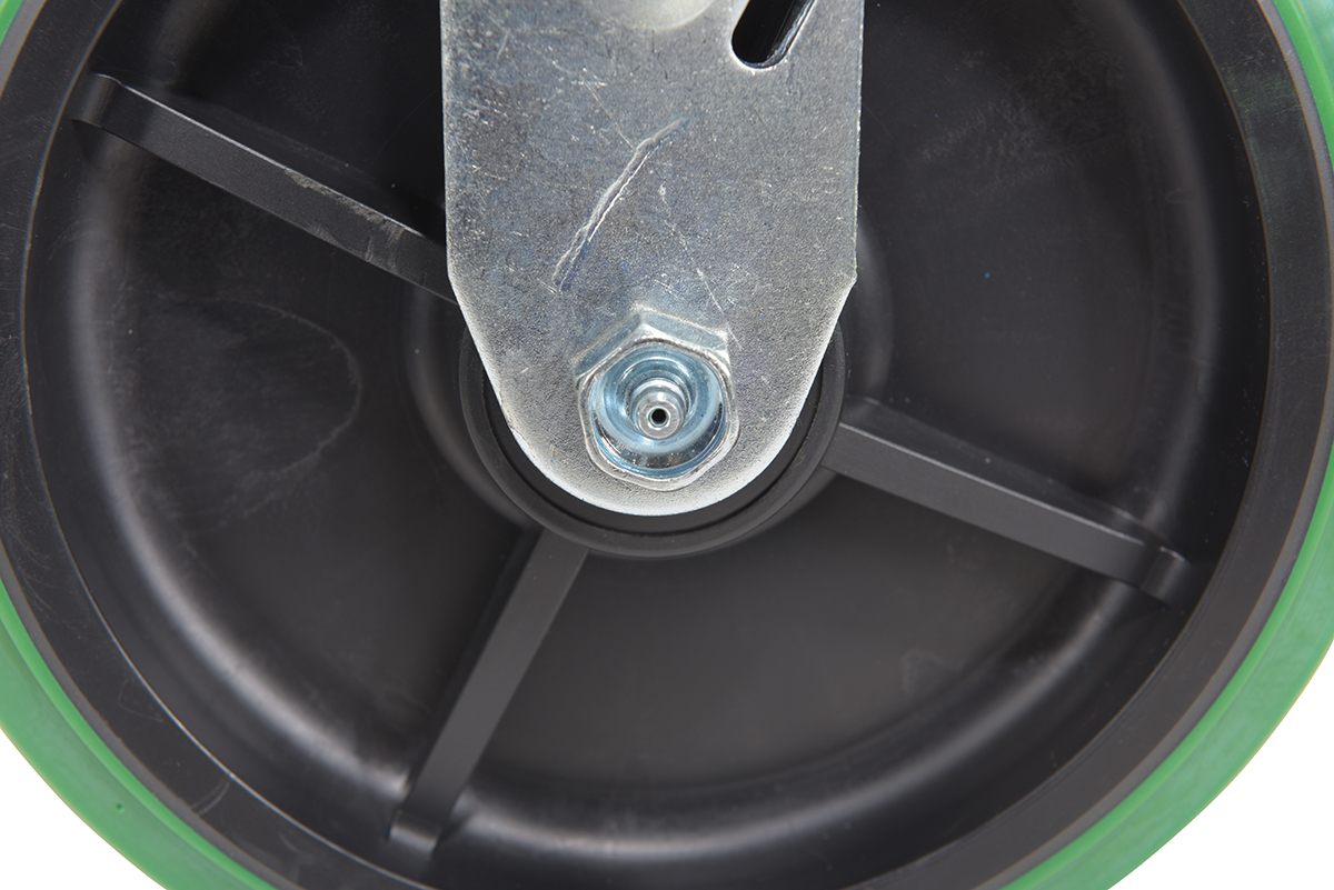 Made with 100% pure polyurethane tread. This caster is a great upgrade for standard polyurethane. Designed using a new liquid cast flow fusion that ensures a 100% mechanical bond to core and "zero" trapped air. It has a high resistance to debris and most chemicals. The proprietary tread provides good floor preservation, and has a longer life performance than standard polyurethanes. Green tread color. 90-95 shore a. Wheel center is constructed of polyolefin.