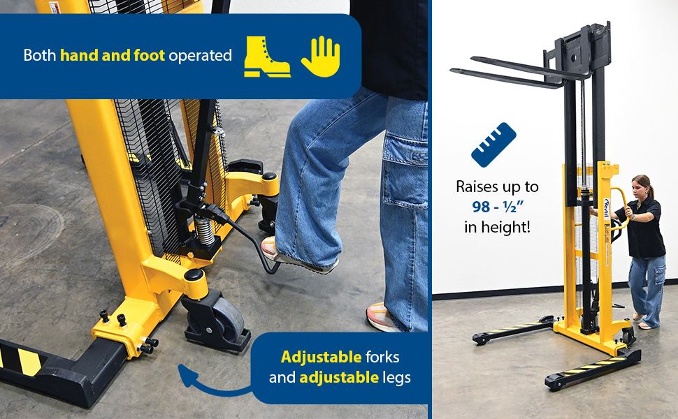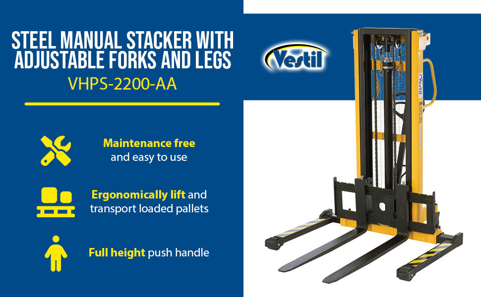 VHPS-2000-AA VHPS-2000-AASteel Manual Stacker Adjustable Forks/Legs 2,000 Lb. Capacity Black / YellowUniform Capacity (lb.): 2,000
