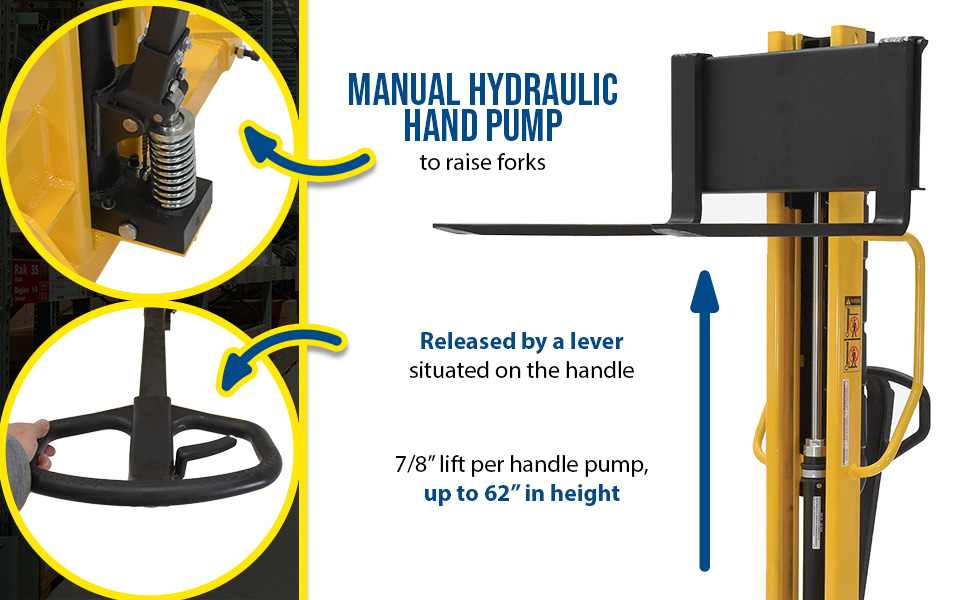 Manual Hydraulic Hand Pump Stackers are sturdy and compact to fit through standard height doors. Forks are raised by manual hydraulic hand pump operation and released by a lever situated on the handle. 3/4" lift per handle pump. Two rigid and two swivel wheels standard.