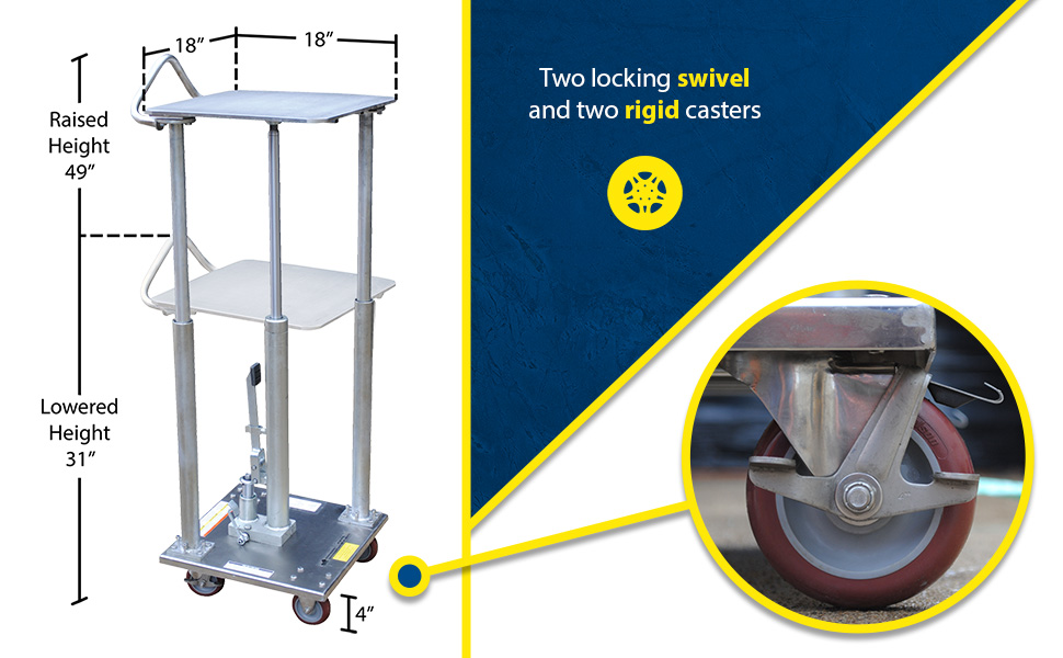 Hydraulic Post Tables are ideal in material handling facilities. The unit can be of use in a variety of environments from lifting dies and castings to moving machine parts. The corner posts are telescoping to help stabilize and fully support the load during operation. The tables roll smoothly on two (2) locking swivel casters with brakes and two (2) rigid. The tables can be lifted/lowered with a single speed foot pump, two-speed foot pump, or a two speed auto shifter that automatically shifts when the table is loaded. DC units include one (1) 12V battery to raise and lower the platform. They also include a battery, on-board charger, and a hand control on an 8 ft. coil cord. *PP stands for poly-on-poly casters. PS = poly-on-steel casters. PP = polypropylene casters. Model HT-02-1616A and HT-03-1616A includes a platform that swivels 360 degrees for use as a turntable. Model HT-02-1616A, HT-03-1616A and HT-05-1818A standard with a removable rubber platform cover. Partially Stainless Steel Post Tables feature a zinc plated pump assembly and leg posts while the platform, base frame, handle, casters rigs, and hardware are stainless steel.