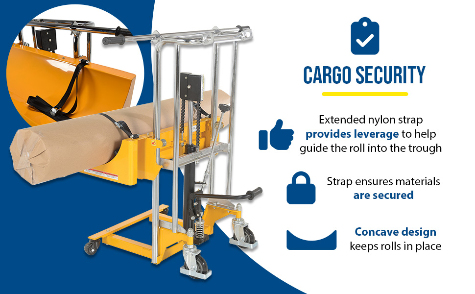 Roll Lifter and Transporters allow single users to maneuver heavy duty rolls onto the lifter and then directly onto the printer feeder. Extended nylon strap provides leverage to help guide the roll into the trough and ensure materials are secured for transport. Concave trough design of the media tray stabilizes rolls for transit. Foot pump allows for smooth and effortless lifting. Heavy duty swivel casters in both front and rear allows the user to maneuver through standard doors and narrow passages. Maximum roll diameter is 15-3/4".