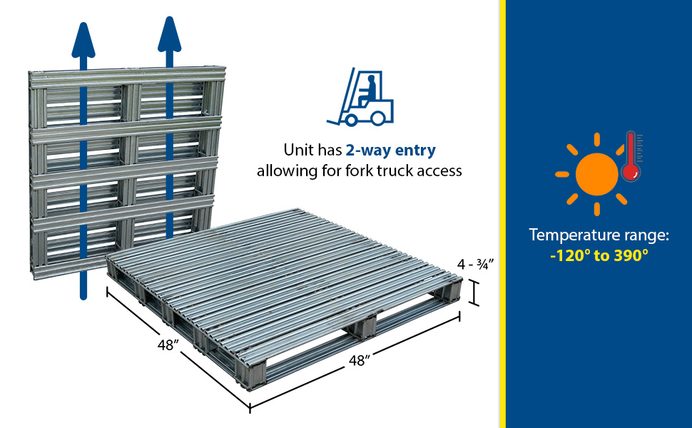 Heavy-duty non-reversible welded steel pallets. Usable fork openings are 3-7/8" high. Model SPL-3636 has 4-way entry allowing for access for both fork and pallet trucks. Models SPL-4048, SPL-4248 and SPL-4848 have 2-way entry and allow access for fork trucks only. Hot-dipped galvanized finish offers rust resistance.