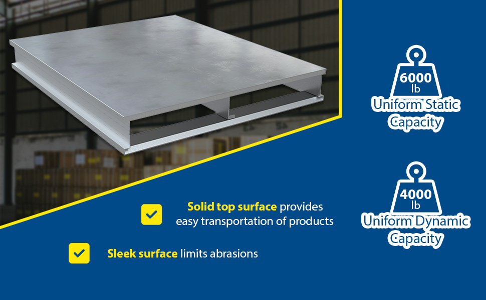 AP-ST-4824 AP-ST-4824Aluminum Heavy Duty Solid Top Half Pallet 24 In. x 48-1/8 In. x 6 In. 4000 Lb. Capacity SilverUniform Capacity (lb.): 4,000