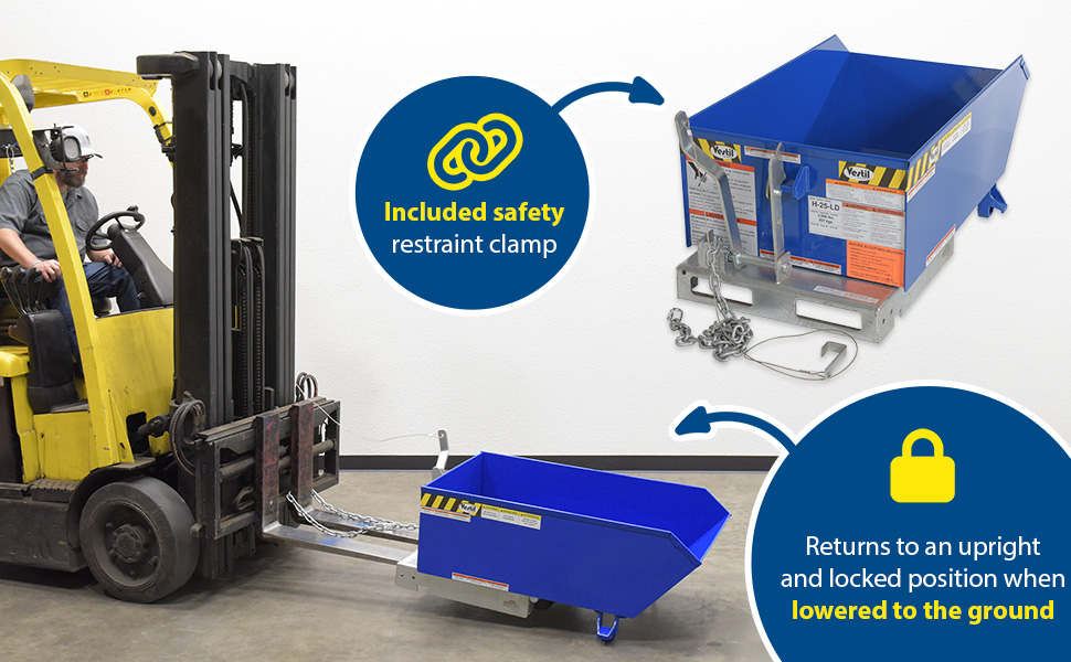 Units feature a full 90 degrees dump angle with a cushioned rubber bumper stop. The low profile design is essential for convenient loading. Dumping with a fork truck is quick and simple. A cable is pulled from the seat of the fork truck to dump the hopper. The unit returns to an upright and locked position when lowered to the ground. The included safety restraint/chain must be securely attached to the lift truck without slack. 22" L usable fork pockets measure 7"W x 2"H. Formed base thickness is 1/4". Blue baked-in powder-coated toughness with a galvanized base. Models H-25 may be stacked with H-50 models,while, the H-100 can be stacked with the H-150 models. The H-200 hoppers can only be stacked with other H-200 series models. Never stack hoppers more than 3 high. Must be attached to fork truck when dumping.