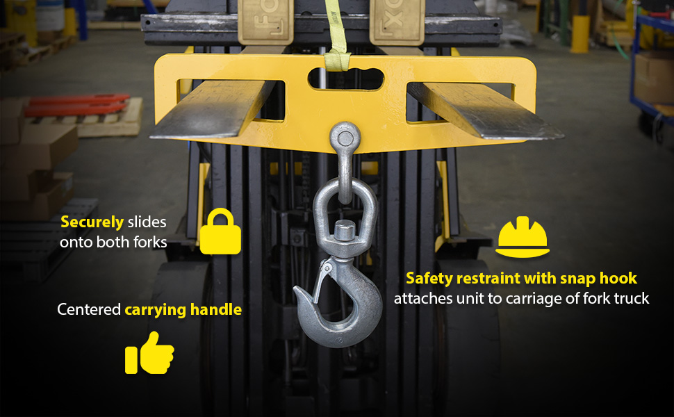 Hook Plates enable any fork truck to safely lift a load using chains, cables, or slings. Features slanted fork openings measuring 6-1/2" wide by 1-3/4" high to prevent the hook plate from being used upside down. A hook with anchor shackle is included. A safety restraint secures the unit to the fork truck. Model LM-HP10-SL has fork openings measuring 7"x2" and includes a swivel lifting hook with a latch.