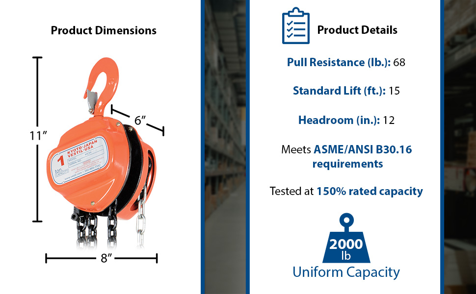 HCH-2-10 HCH-2-10Steel Manual Chain Hoist 10 Ft. Lift 2,000 Lb. Capacity OrangeUniform Capacity (lb.): 2,000