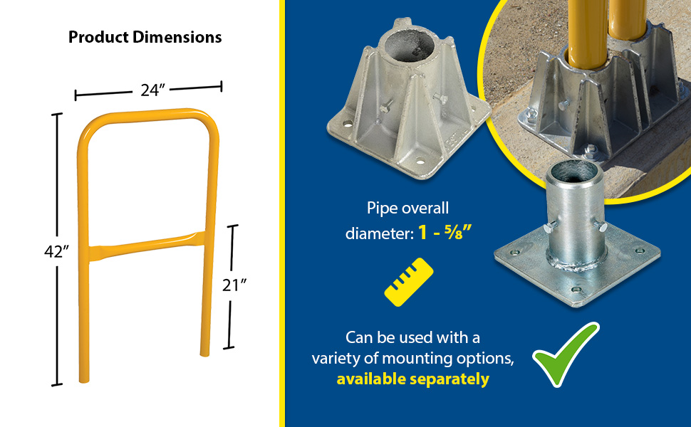 Protect people from uneven walkways and mezzanine drop-off's. The safety railing is constructed of schedule 10 steel. All models have an outside pipe diameter of 1-5/8". Handrails are 42" high with a 21" mid-rail. Mounting options include socket sleeves, cast steel base, barricade base, or cast steel sockets for convenient handrail removal. The cast steel sockets accept wood 2" x 4" or 2" x 6" when toe boards are required. Two (2) lag down holes are pre-drilled for permanently mounting the railing. The steel design includes a baked-in powder-coated finish, which is available in a variety of colors found in the table below. The VDKR series safety rail products comply with U.S. Occupational Safety and Health Administration (OSHA) General Industry requirements for guardrail systems in 29 CFR 1910.29.