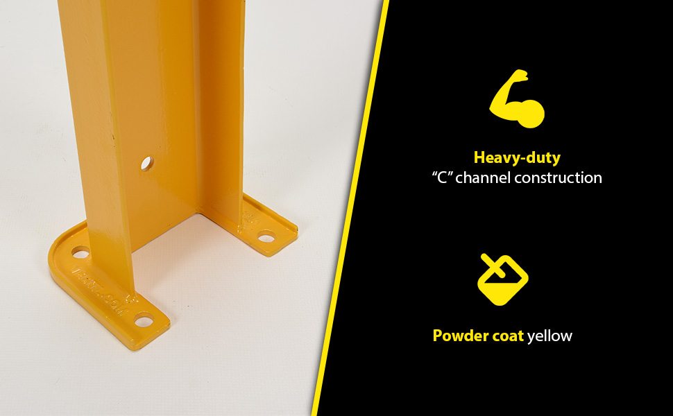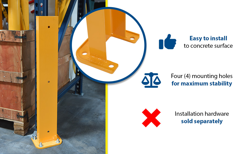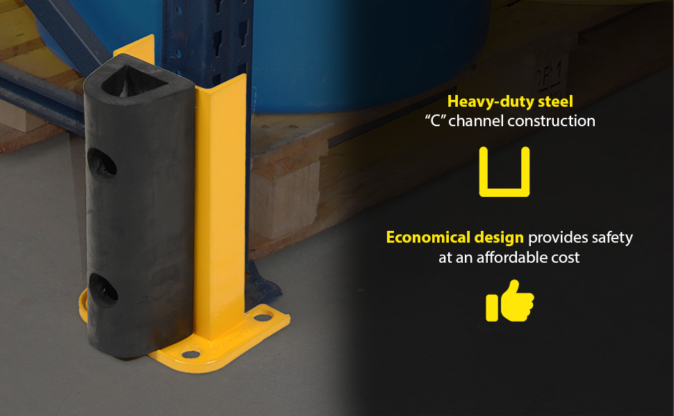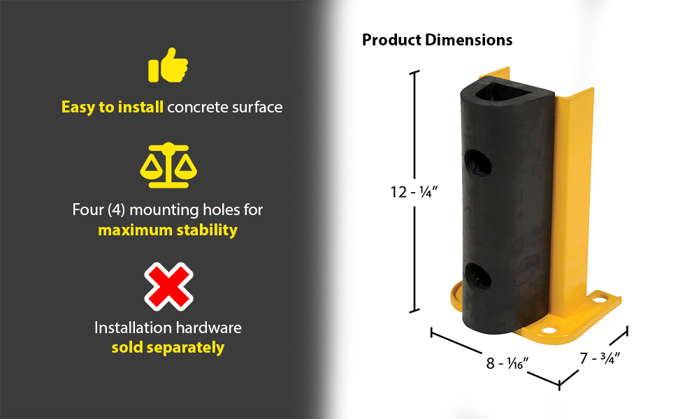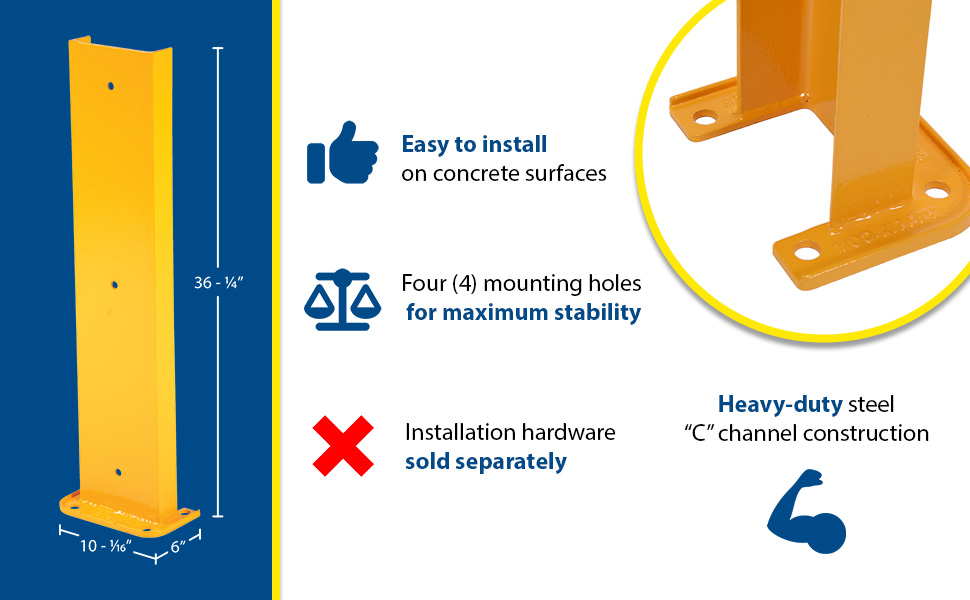 Economical way to protect against damage to pallet racking and wall corners. Constructed of 6" or 8" steel "C" channel for durability. Available with or without a rubber bumper. Easy to install to concrete surface. Four mounting holes for maximum stability. Safety yellow Baked-in powder-coated toughness. Models G6 require 1/2" anchor bolts. Models G8 require 3/4" anchor bolts. Installation hardware sold separately.