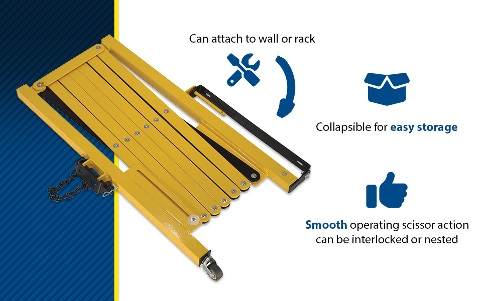 Designed to set up quickly and easily wherever and whenever they are needed. Ideal for preventing potential accidents. Lightweight design allows personnel to quickly retrieve the gate and limit access to unsafe areas. Smooth operating scissor action. Interlocking and nestable. Suffix -C features casters. Suffix W features one swivel caster with a wall/rack mounting kit.