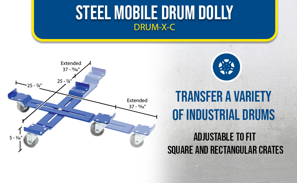 DRUM-X-H DRUM-X-HSteel Mobile Drum Dolly-Adjustable with Hard Rubber Wheels 25-7/8 In. x 25-7/8 In. 5-5/16 In. 1000 Lb. Capacity BlueUniform Capacity (lb.): 1,000