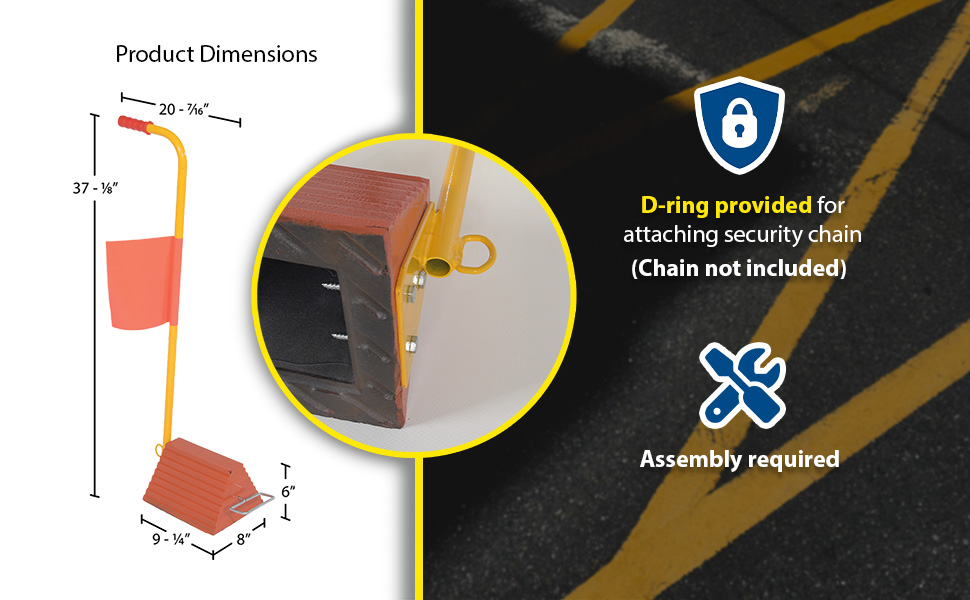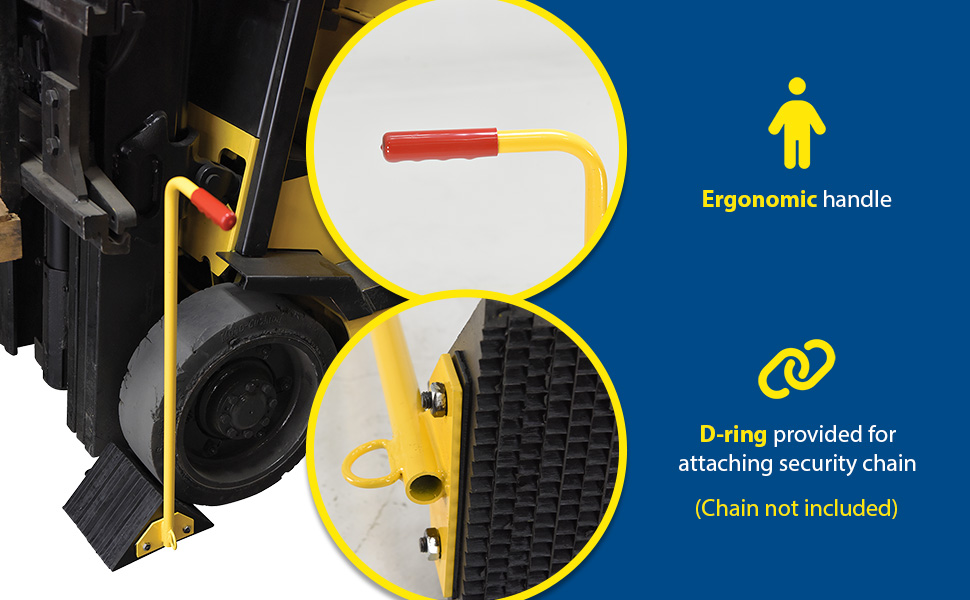 Ergonomically designed to make it easy to move wheel chocks in and out of position under trailer wheels. Reduce the risk of back, knee, and foot injuries. Handle is constructed of steel and includes a yellow baked-in powder-coated toughness. D-Ring provided for attaching security chain (chain not included.) Assembly required.