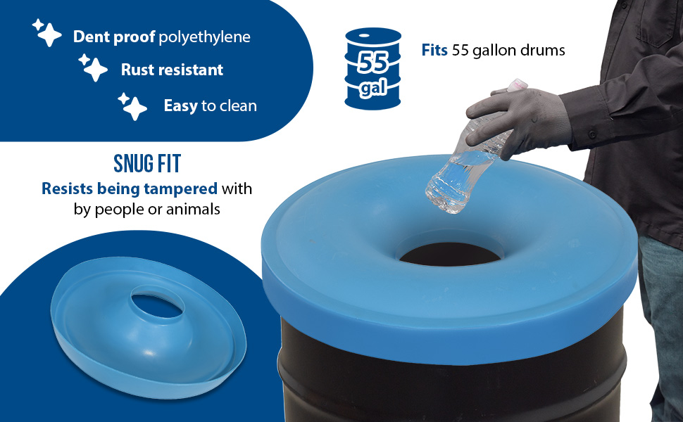 Collecting aluminum cans or plastic bottles could not be easier with Recycling Lids. Fits on open head plastic or steel drums only with lid and ring are removed. Low-density polyethylene construction. Fits snug to resist blowing off in outdoor environments or being tampered with by people or animals. CANF models have a flap to help discourage the removal of contents.