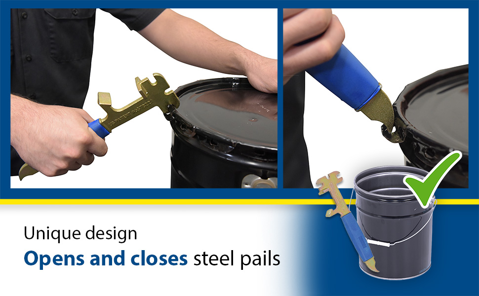 A must-have product for anyone using five gallon plastic and steel pails. The cutter is used to cut a slit in the lid lip of the pail to enable the lid of the plastic pail to be removed. The side guide conveniently slides under the lid lip for easy removal of the lid. The end hook is used to open steel pails. Just hook the lid lug and pry open. The opposite end is used to close and seal the lid by bending the lip back around the steel pail top. Not for UN rated pails.