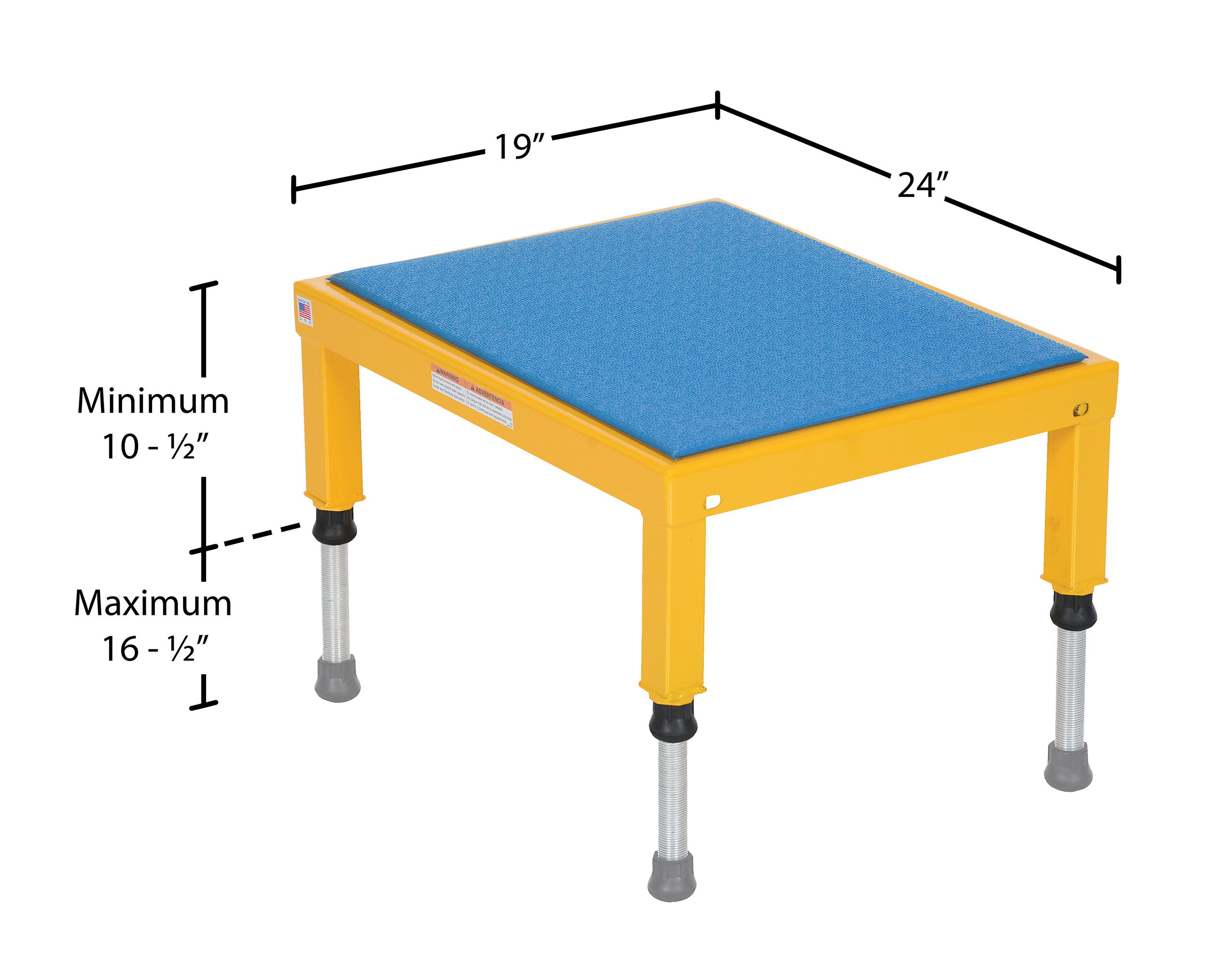 The adjustable work-mate stand minimizes fatigue by elevating workers to heights that are comfortable and ergonomically correct. Especially useful when multiple shift employees operate the same piece of machinery. The ergonomic matting deck style provides comfort for the operator who stands all day. The height of each leg can be adjusted individually to ensure proper working height.