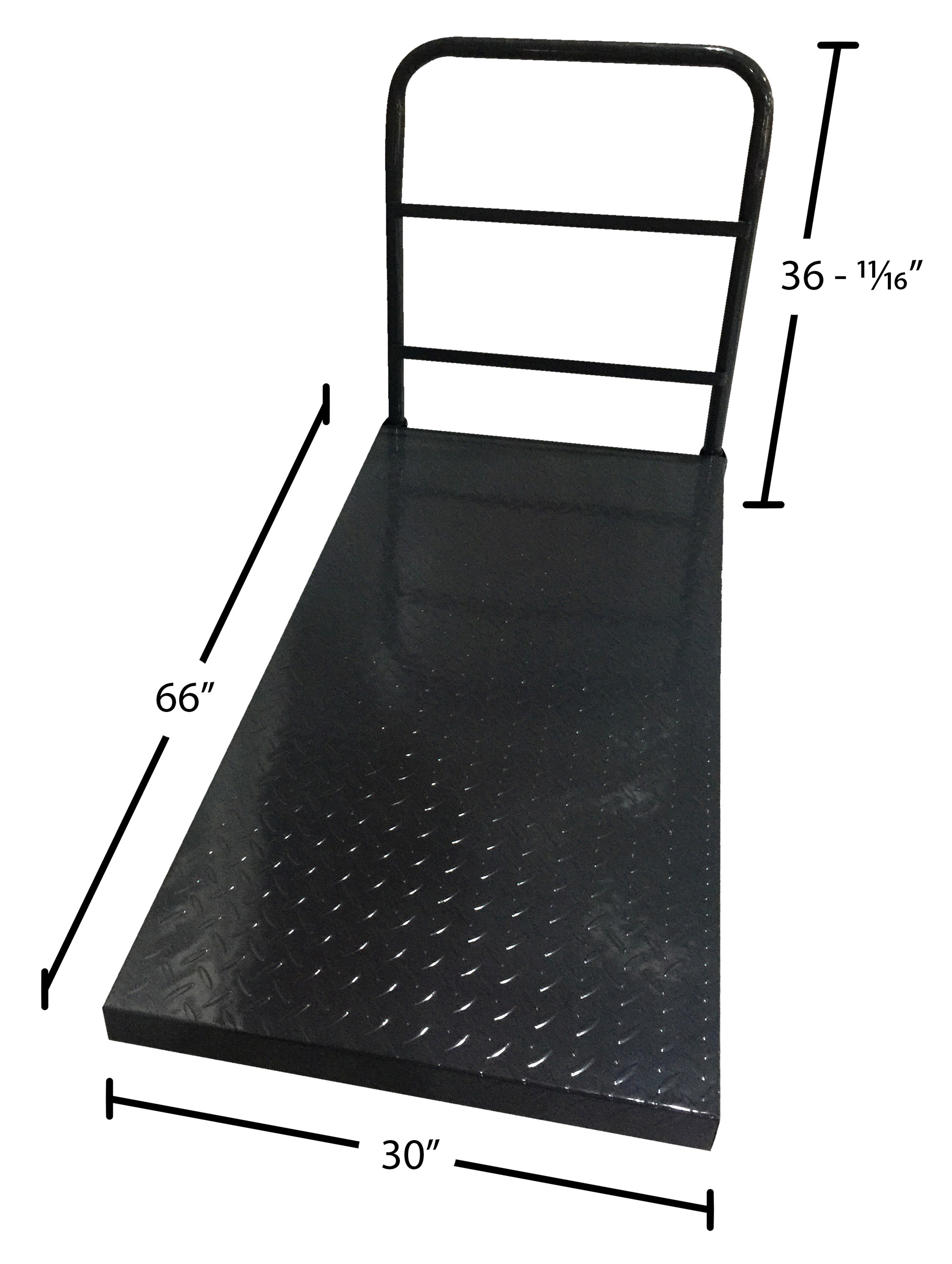Steel Tread Plate Platform Truck 30 In. x 60 In. 2000 Lb. Capacity BlackA steel tread plate on a platform truck is an upgrade to an old classic. The tread plate design provides the user with a better sense of security. With this added texture, the amount of jostling and movement by the products on the platform is limited. The steel handle allows the user to maintain an ergonomic posture while transferring goods. Mold on rubber casters roll smoothly. Powder coated finish provides added toughness.
