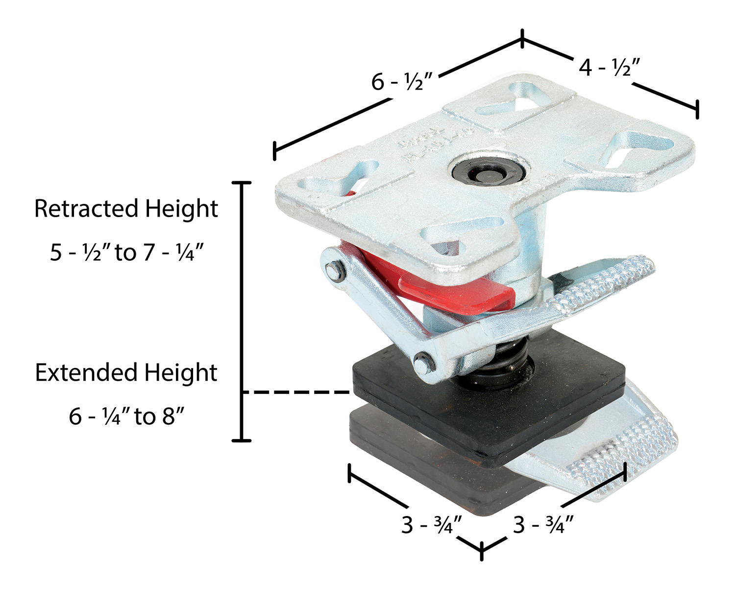 Used with Caster Size (in. - in.): 4 to 6 Extended Height (in. to in.): 6-1/4 to 8 Retracted Height (in. to in.): 5-1/2 to 7-1/4