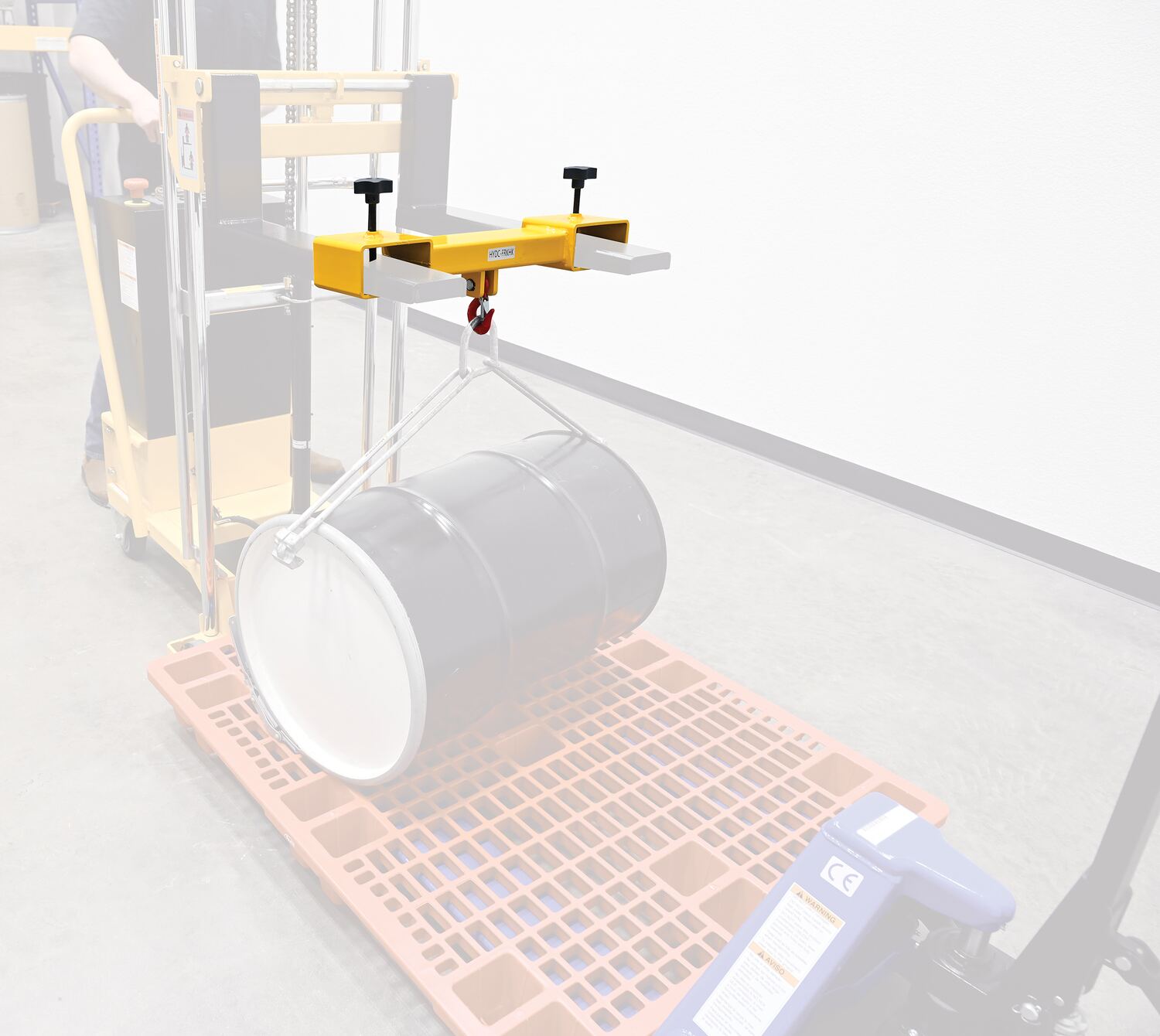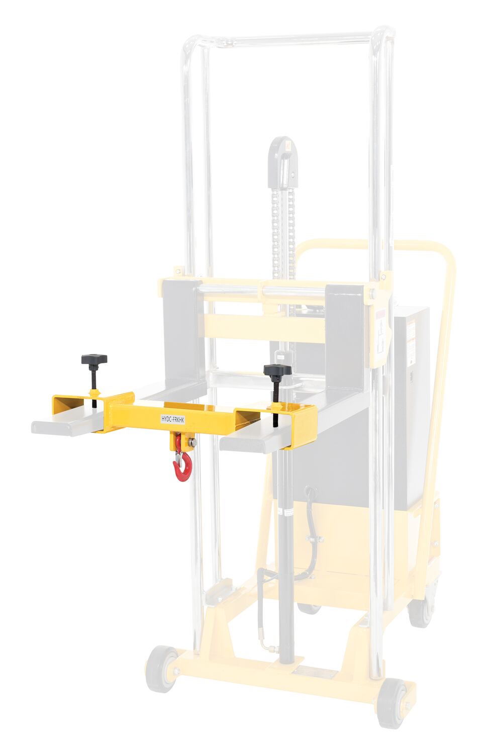 The hook attachment is designed of a strong construction for lifting awkward heavy products. A simple installation allows the user to obtain immediate use of the hook and start maneuvering products. A bright yellow finish promotes safety and visibility while transferring units.