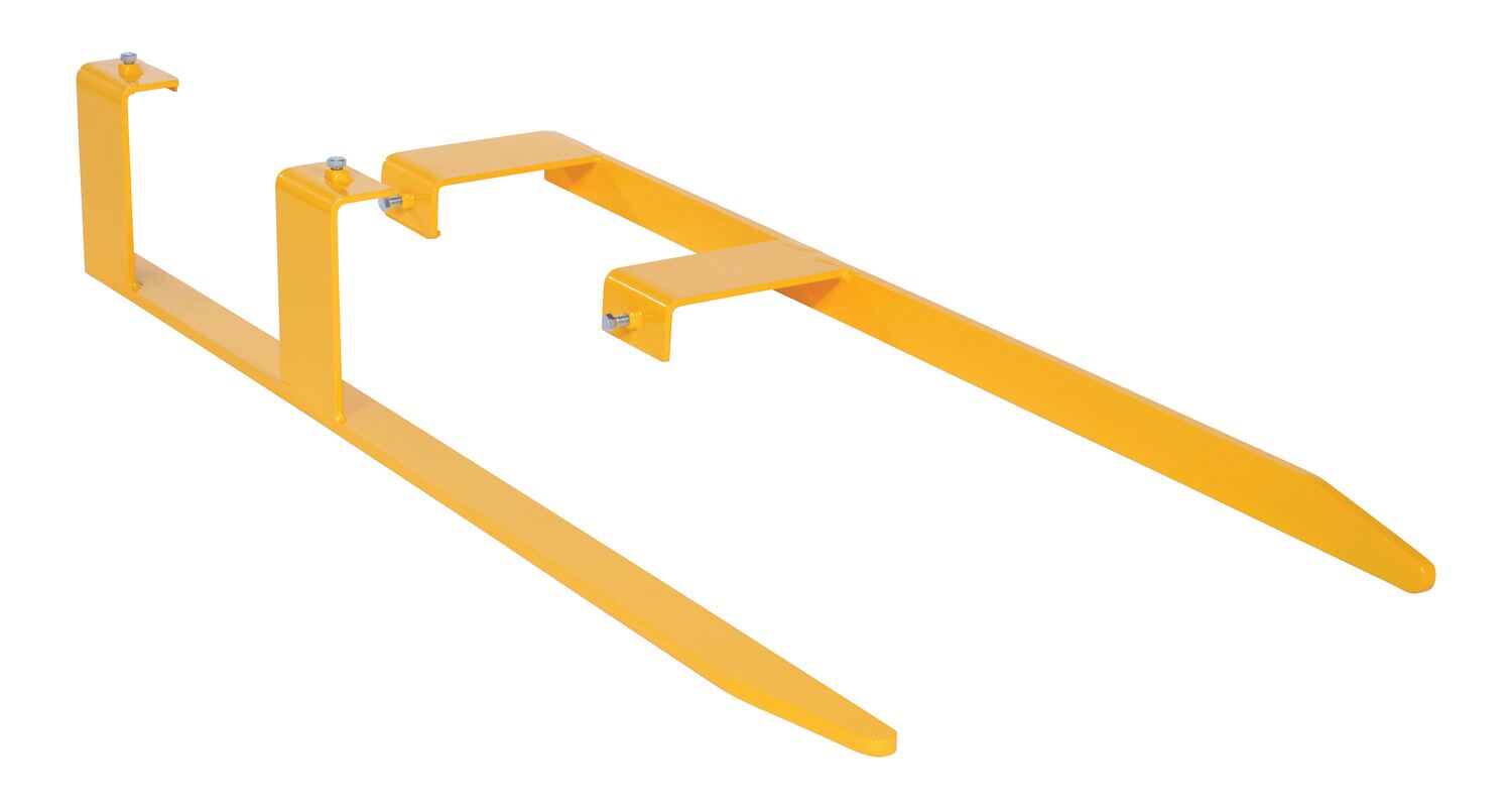 Steel Pallet Master Fork Extensions 6 In. x 48 In. YellowA pallet master fork extension provides the ability to lift and maneuver pallets of a variety of sizes. With the help of these extensions, each user is able to lift pallets that are longer than the standard size. The installation process is quick; culminating in the extension being secured directly to the fork itself. Capacity for each extension is determined by the capacity of the pallet master it is attached to.