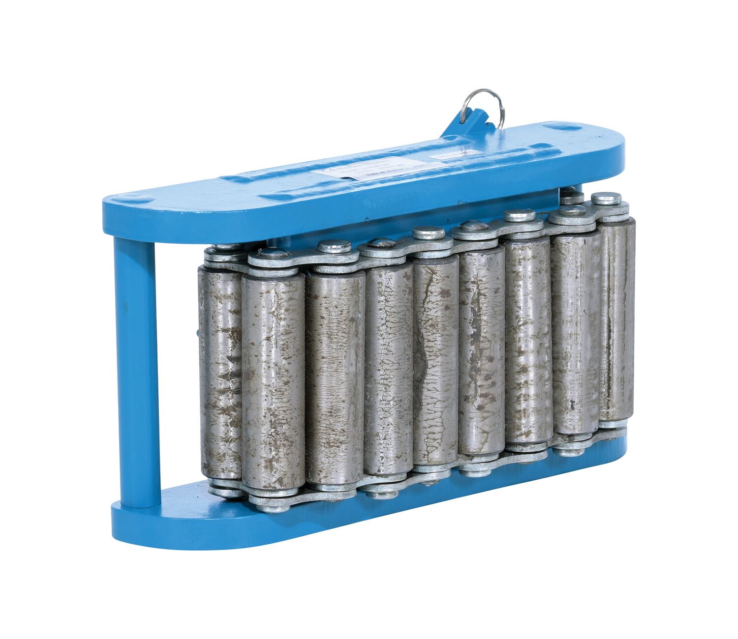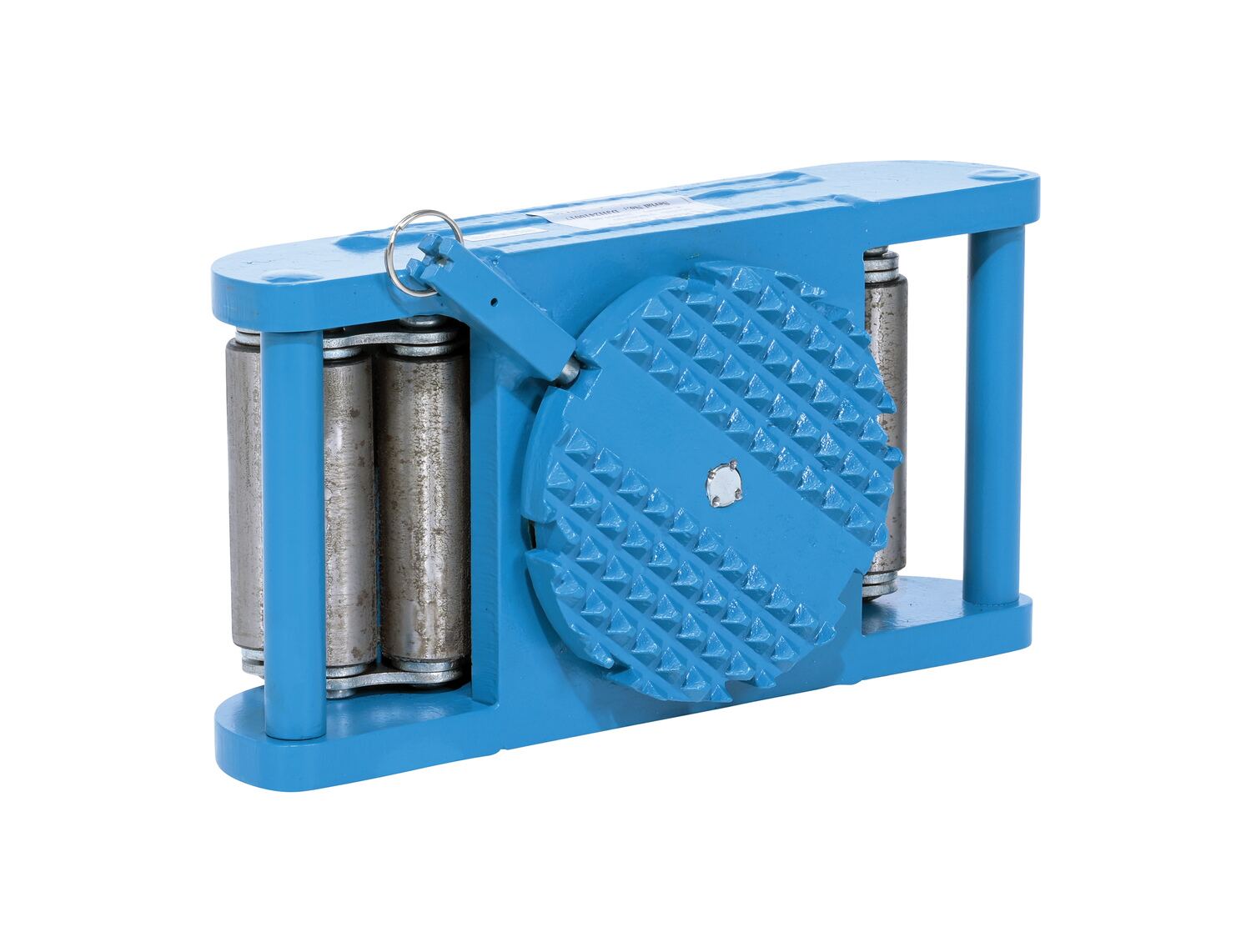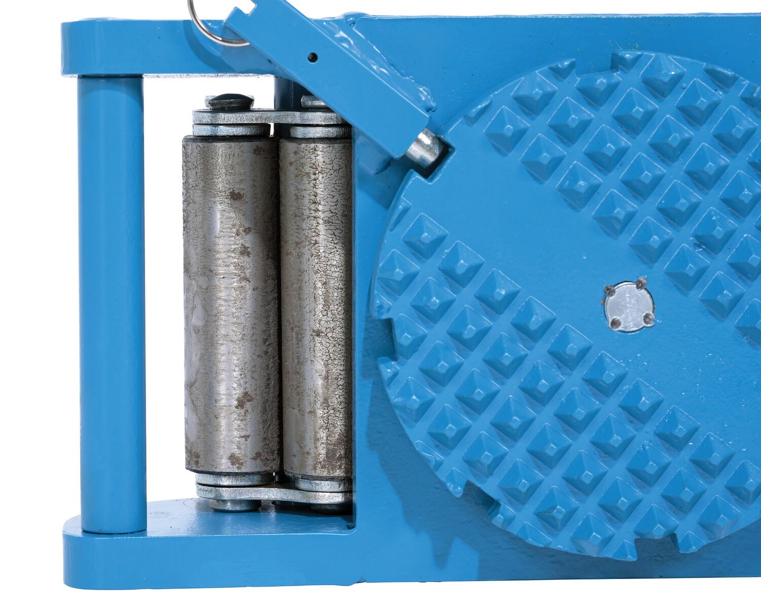 Made of high-strength annealed ductile iron, this steel machine roller has swivel tops that rotate three hundred sixty degrees (360 degrees) on chrome steel ball bearings to allow for easier turning. The rollers form a "tank track" to revolve around a center load bearing plate in the frame to provide maximum maneuverability. The weight of the load is transferred directly from the load bearing plate to the rollers, eliminating axle friction and requiring less power to start and move. This unit is virtually maintenance free.