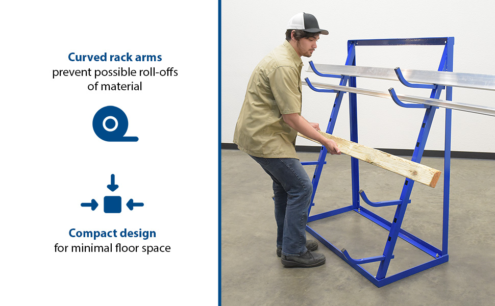 An adjustable bar and pipe storage rack is a great asset for work place organization and efficiency. With a durable steel construction, the rack and arms consistently hold heavy material. The rack arms can be adjusted to a variety of positions to best fit the users' needs. For additional safety, all rack arms are shaped vertically to prevent possible roll-offs of material. The open design also enables loading and unloading from 3 sides.