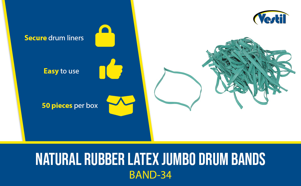 The Pallet Band, model BAND-92, minimizes carton shifting to reduce product damage of pallets in transit. Easy to use without any need for special equipment. Unit is cost effective and environmentally friendly. Moisture will not get trapped under rubber band. Packaged 50 pieces per carton. The Drum Band, model BAND-34, is used to help secure drum liners. Unit is cost effective and environmentally friendly. Packaged 50 pieces per carton.