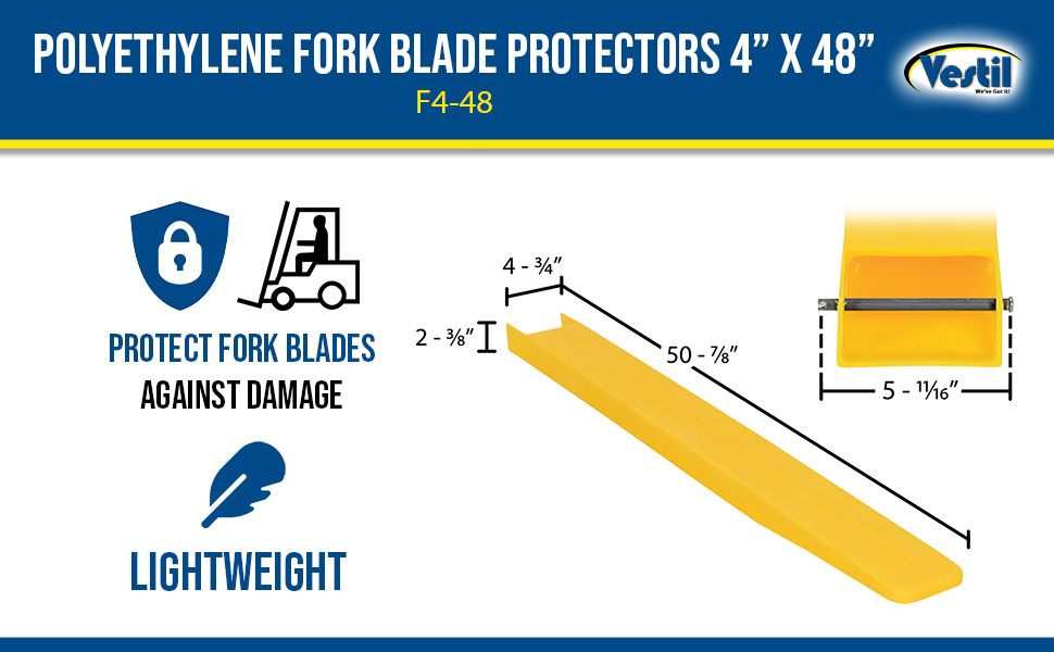 F4-48 F4-48Polyethylene Fork Blade Protectors 4 In. x 48 In. YellowUse with Fork Blades Width/Length/Height (in.): 4 x 48 x 2