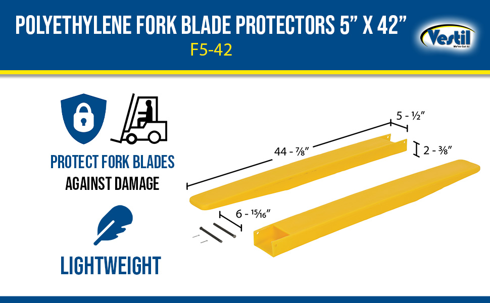 F5-42 F5-42Polyethylene Fork Blade Protectors 5 In. x 42 In. YellowUse with Fork Blades Width/Length/Height (in.): 5 x 42 x 2