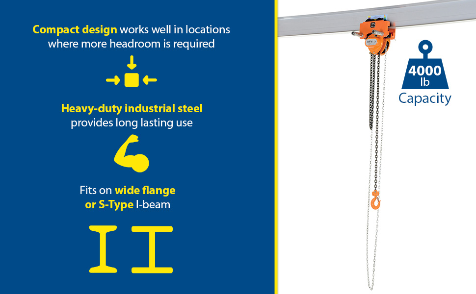 LOW-4P LOW-4PSteel Low Headroom Chain Hoist Push Trolley 14 In. x 11-1/2 In. x 14 In. 4,000 Lb. Capacity OrangeUniform Capacity (lb.): 4,000