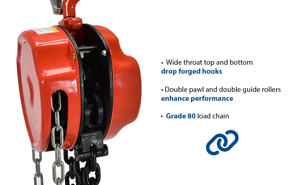 These portable, lightweight hoists are durable and easy to operate. Compact design and low headroom allow installation in confined areas. Enclosed double ratchet pawls with self adjusting disc brake standard. Designed with a safety factory 4 times rated capacity. Individually tested at 150% rated capacity. Features grade 80 black chain tempered to ISO 3077, pull chain, hardened two-stage gears and forged steel upper and lower hooks with safety latches. Constructed of high quality steel components ideal for industrial applications. Meets ANSI B30.16-2003 requirements.