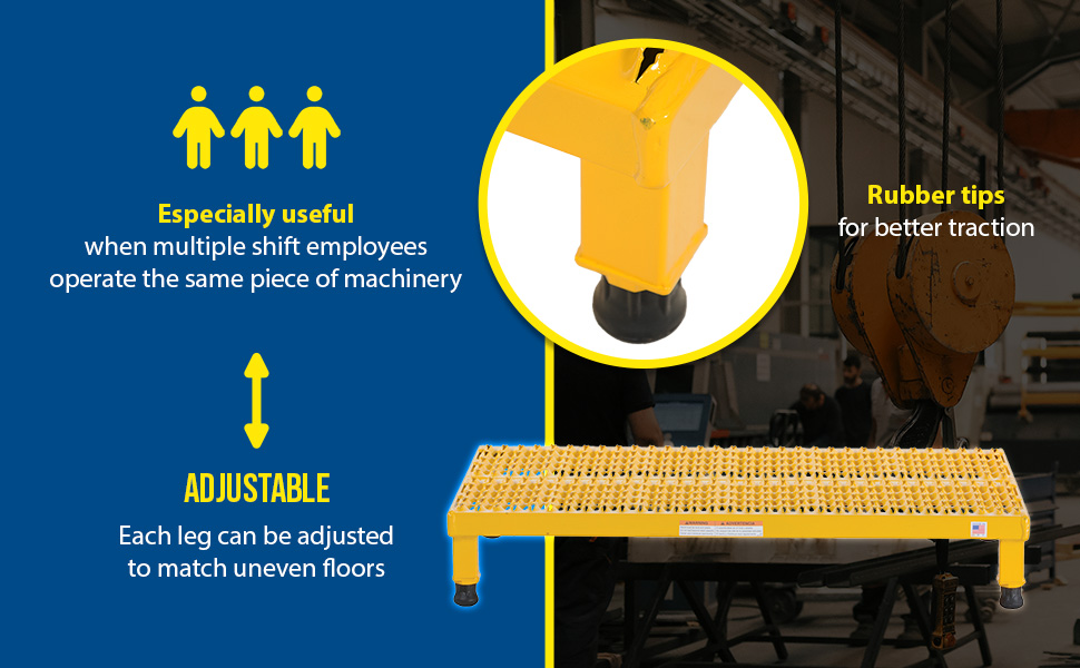 Often times work areas can be ergonomically unfriendly places. Those conditions can be even further exaggerated when different shift employees work on the same equipment. But, with an adjustable work-mate stand it's easy to elevate workers to new heights! If floors or surfaces are uneven, don't worry, each leg is adaptable and can be lowered or raised to best fit the circumstance. Whether you are looking for a single person design or a model that can accommodate multiple users, we've got it! All sizes have four (4) legs except the 60", 72", and 96" long models which have six legs.