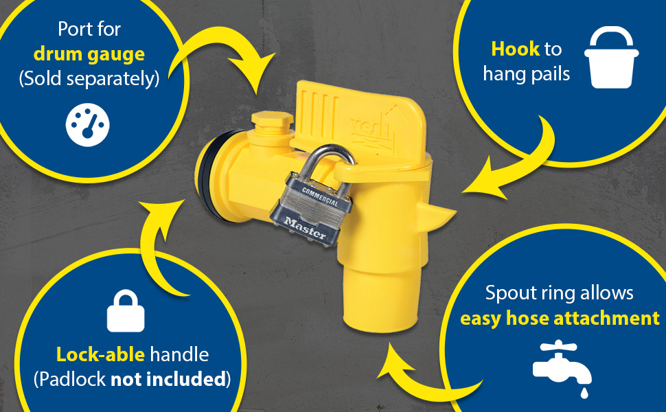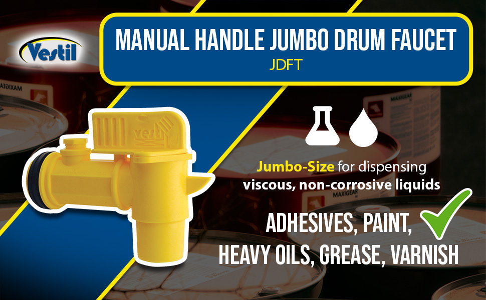 The Jumbo Drum Faucets, model JDFT, are ideal for dispensing viscous, non-corrosive flammables such as adhesives, paint, heavy oils, grease, and varnish. Padlock not included. Integral hook allows users to hang pail on faucet (51 pounds).