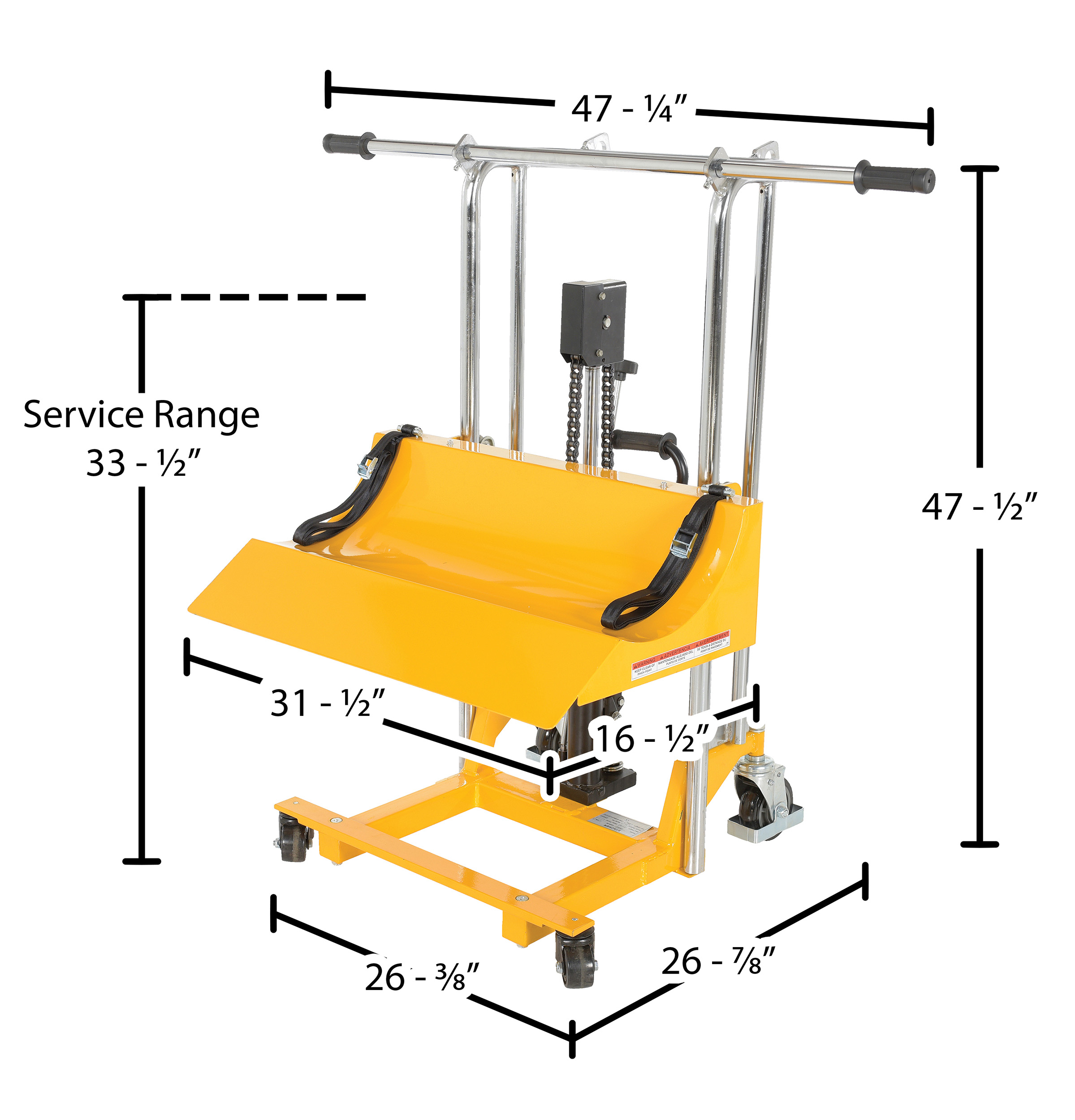 Steel Roll Lifter Transporter 15-3/4 In. Roll Diameter 880 Lb. Capacity YellowRoll lifter and transporters allow single users to maneuver heavy duty rolls onto the lifter and then directly on the printer feeder. Extended nylon strap provides leverage to help guide the roll into the trough and ensure materials are secured for transport. Concave trough design of the media tray stabilizes rolls for transit. Foot pump allows for smooth effortless lifting. Maximum roll diameter is 15-3/4".