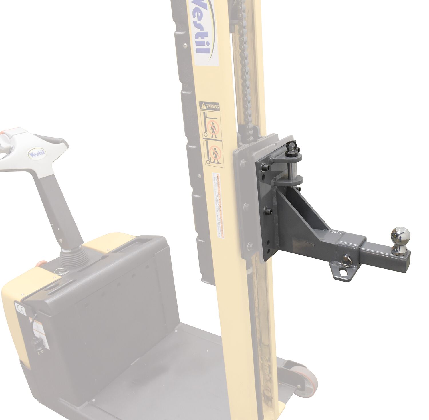 A single ball hitch is a durable accessory for the narrow mast stacker. The unit as a whole is attached to the mast of the lift with a bolt and nut connection. With a unique design style, the hitch can be secured into and disconnected from the receiver with ease. An additional pin, secures the hitch into place minimizing any jostling or movement. The hitch is extended away from the mast of the unit giving much needed space when maneuvering the hitched products.
